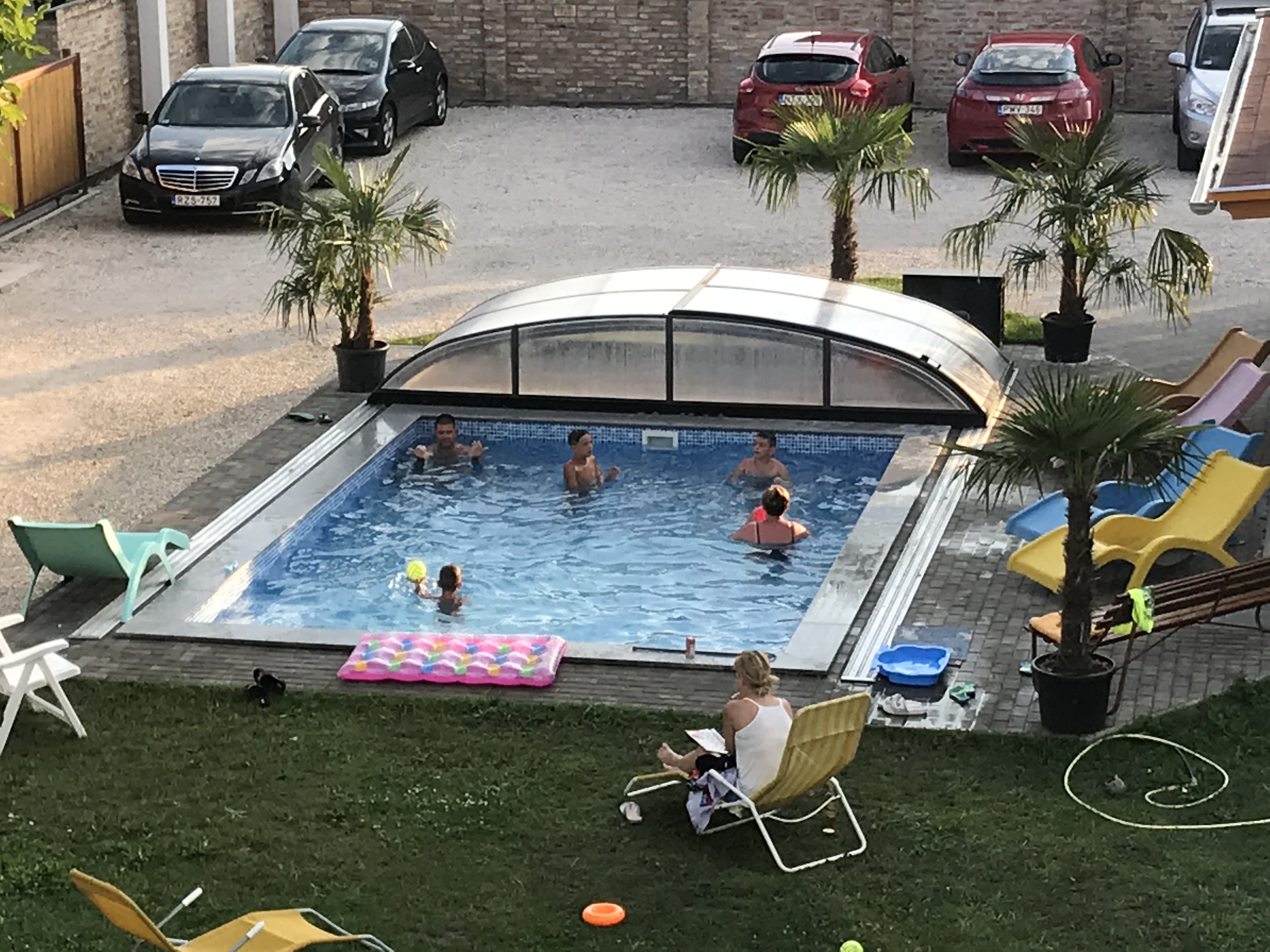 terasz, autóbeálló, hatalmas kert, fűtött fedett medence, KLIMA