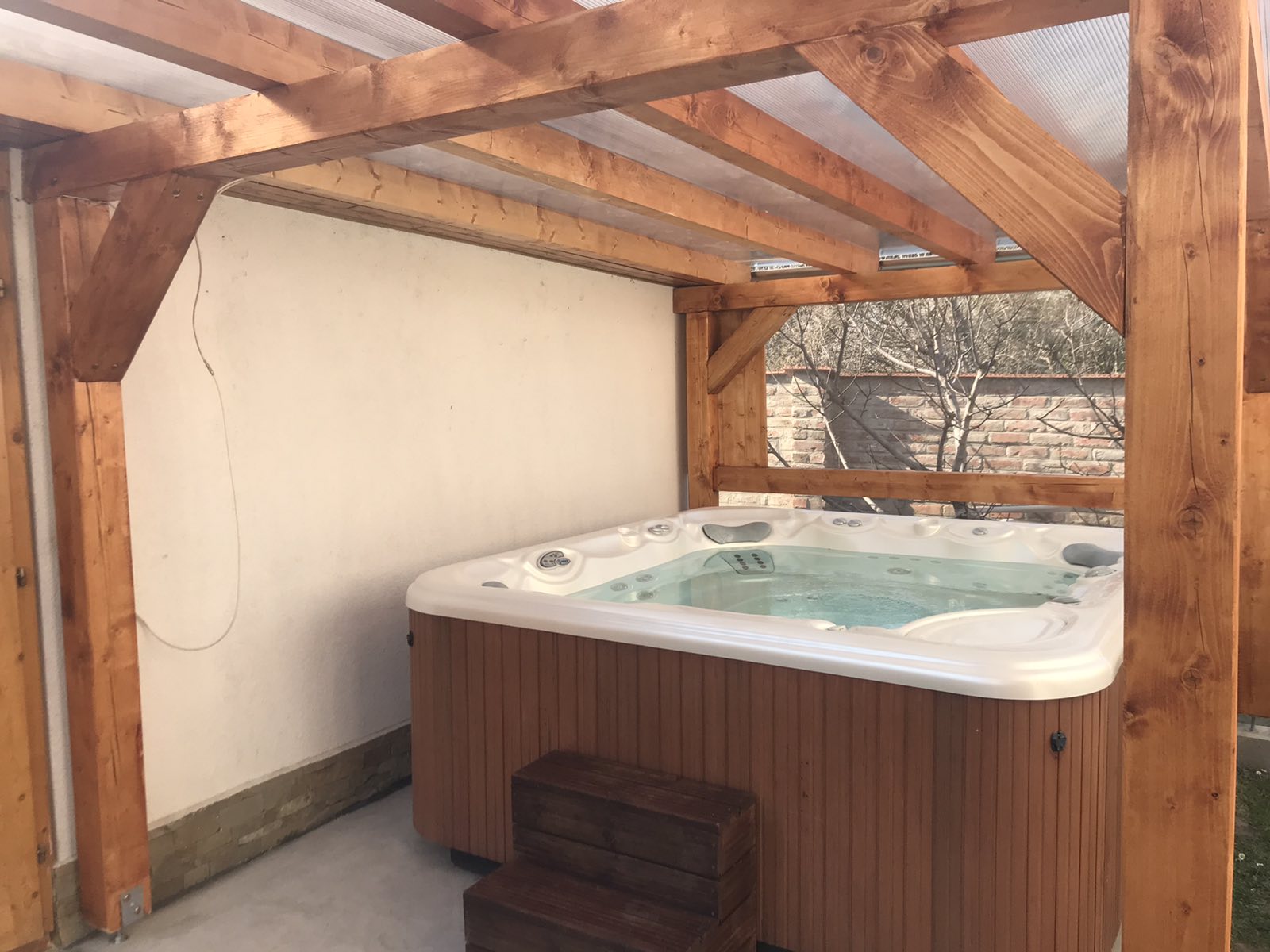 terasz,  autóbeálló, hatalmas kert fedett fűthető medencével