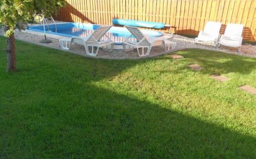 terasz, autóbeállók, nagy kert, parkoló, napozóágyak, medence