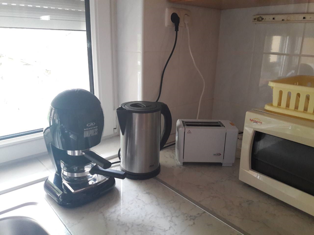A konyhában mikrohullámú sütő, kenyérpirító, melegszendvics- sütő,  és INOX edénykészlet található