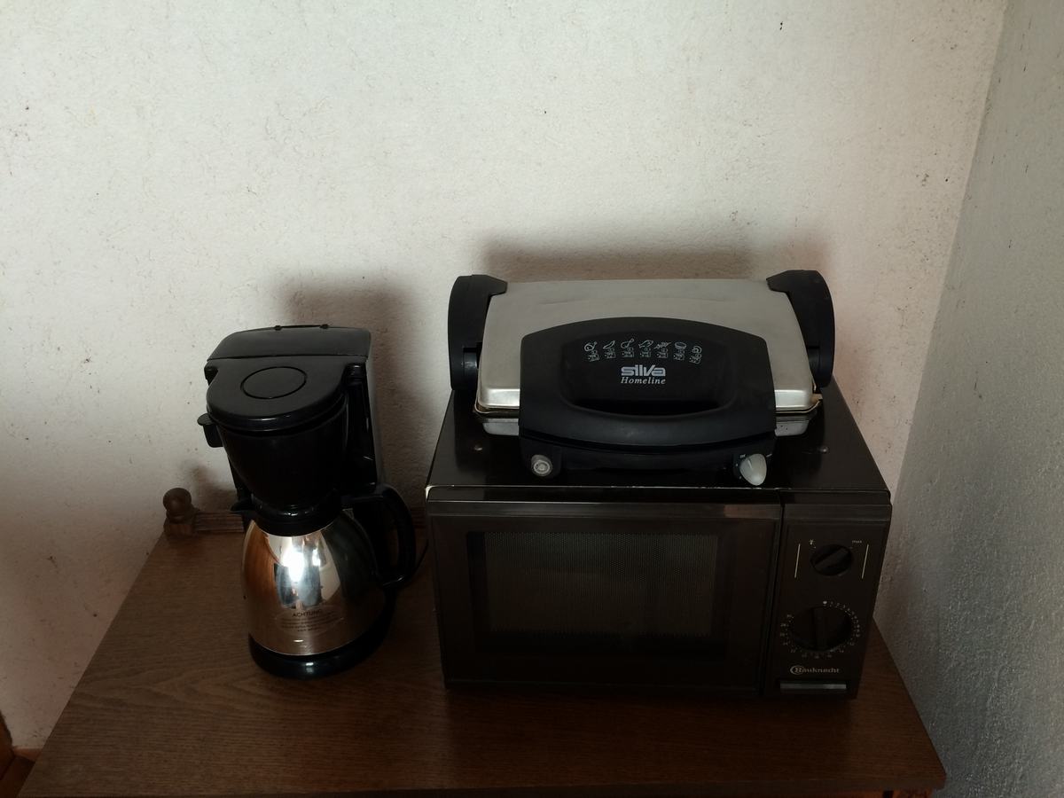 A konyhában mikrohullámú sütő, kenyérpirító, melegszendvics- sütő,  és INOX edénykészlet található
