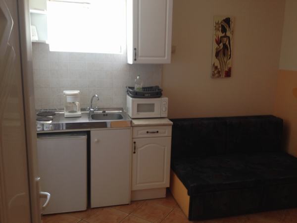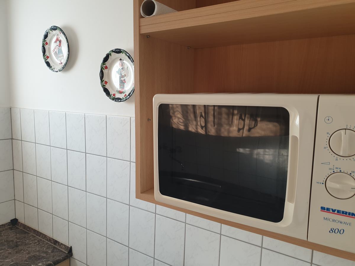 A konyhában mikrohullámú sütő, kenyérpirító, melegszendvics- sütő, és INOX edénykészlet található