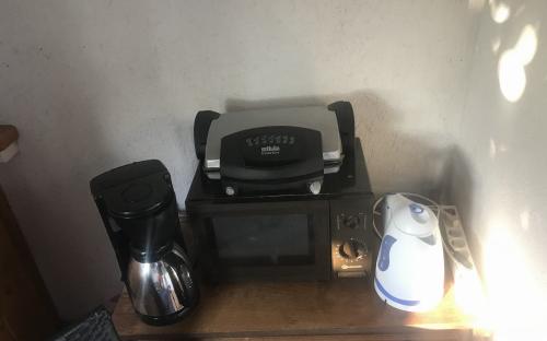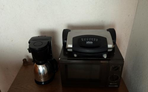 În bucătărie aparat micro, aparat de prăjit pîine ap. de făcut sendvici cald şi garnitură de vase INOX